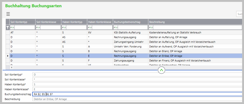 Beispiel für den hinterlegten Buchungstext in der Buchungsart: