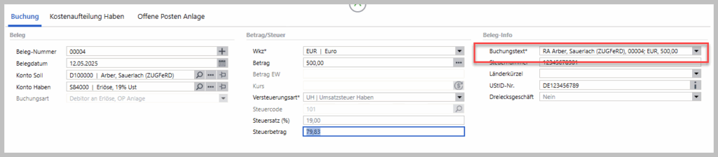 Automatisch erstellter Buchungstext in der Buchungserfassung: