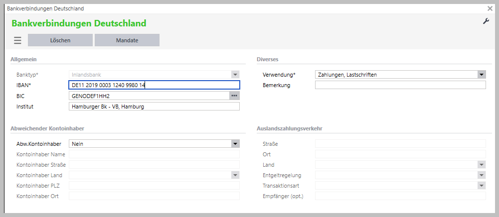 Wenn Sie die Daten einer Inlandsbank eingeben, so können Sie die IBAN- und BIC-Nummer eingeben.