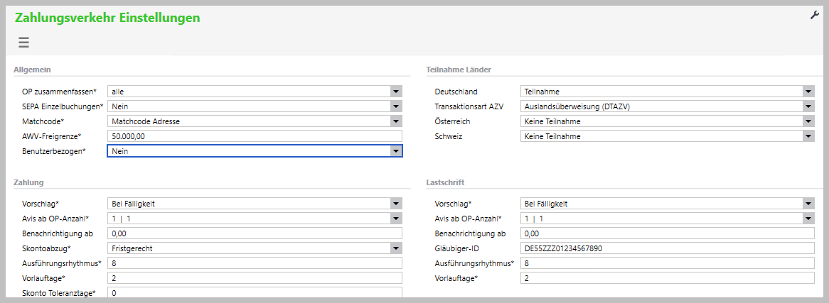 AWV-Meldefreigrenze in EUR wird für den Auslandszahlungsverkehr genutzt (nur Deutschland) und die Gläubiger-ID für SEPA-Lastschriften.