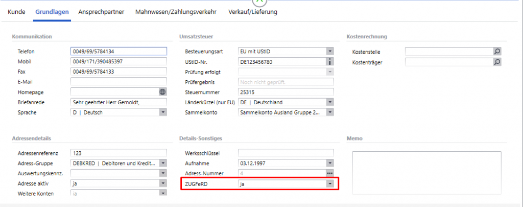 1. Man muss den Kunden für den ZUGFeRD-Versand kennzeichnen, indem man die entsprechende Option in den Grundlagen des Kunden festlegt: