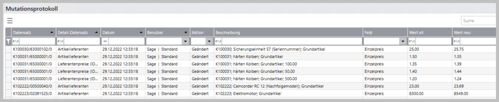 Änderungen oder neue Daten werden im Mutationsprotokoll (Tabelle Artikellieferanten) ausgewiesen, wenn das erweiterte Mutationsprotokoll im Sage 100 Administrator aktiviert wurde.