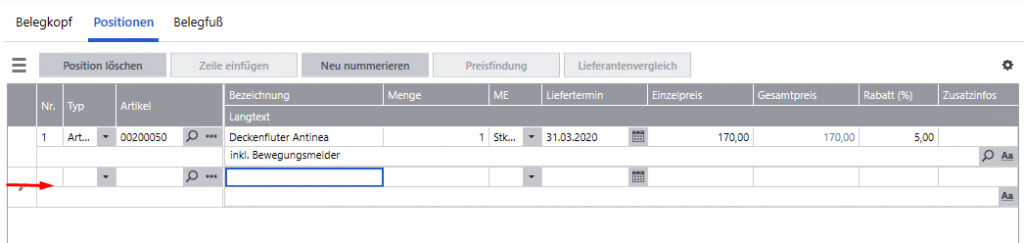 Nach der Übernahme können Sie die Positionen bearbeiten und verändern. Das Löschen von Positionen ist auch möglich: