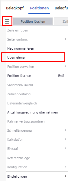 Über das Burger Menü zur Position können Sie nun die Option Übernehmen wählen. Diese Möglichkeit wird nur angeboten, wenn die Positionszeile leer ist: