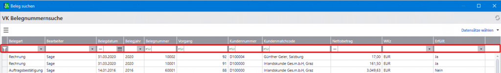 Es öffnet sich der Dialog zur Belegsuche. Über die Sucheinstellungen können Sie aus allen Verkaufsbelegen der Sage 100, unabhängig von der Belegart und dem Geschäftsjahr, den gewünschten Beleg für die Positionsübernahme finden. Nutzen Sie dazu die Filterzeile.