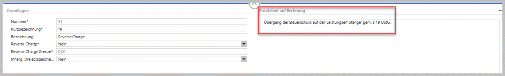 Durch die Hinterlegung des Zusatztextes auf Rechnungen wird dieser Text auf den Rechnungen angedruckt. Eine Übersetzung dieses Textes bei fremdsprachlichen Belegen ist nicht notwendig, da dies ein Hinweis für die österreichische Finanzbehörden ist.