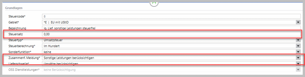 Im Bereich der Positionen wird der Steuercode vorgeschlagen: