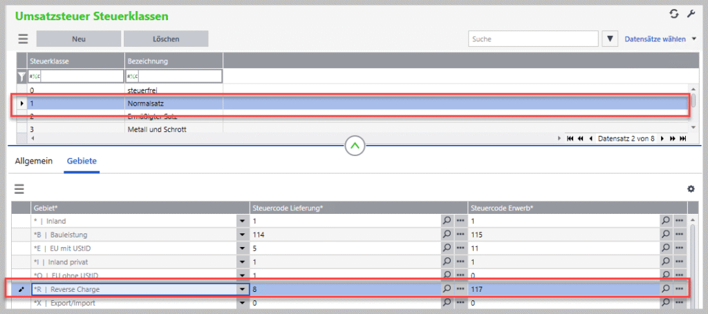 Der Steuercode der Artikelposition wird durch die Kombination von Besteuerungsart und Steuerklasse aus dem Artikelstamm gebildet. Diese Hinterlegung wird im Bereich Grundlagen -> Umsatzsteuer -> Steuerklassen im Register Gebiete vorgenommen: