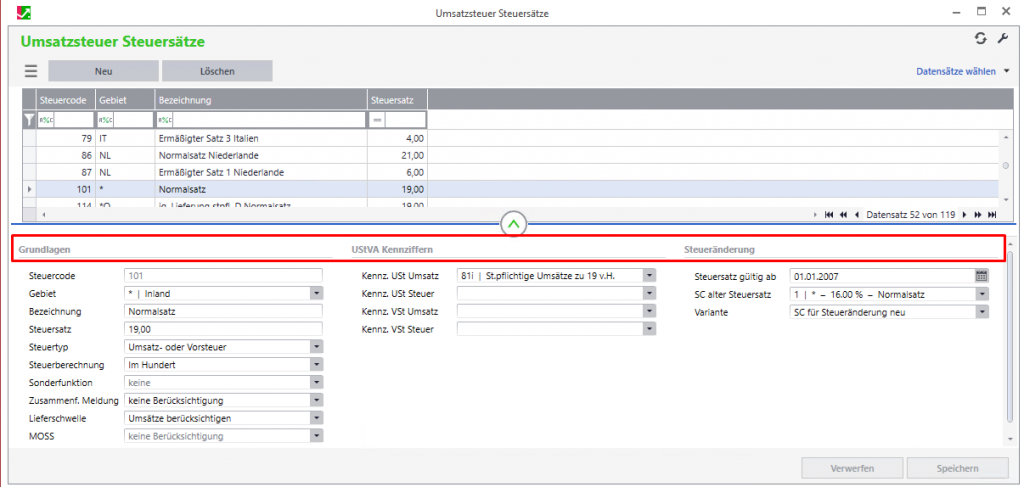 Gerade im Bereich der Umsatzsteuer Steuersätze werden nun alle Informationen auf einer Maske angezeigt. Ein Wechsel der Register ist nicht mehr notwendig: