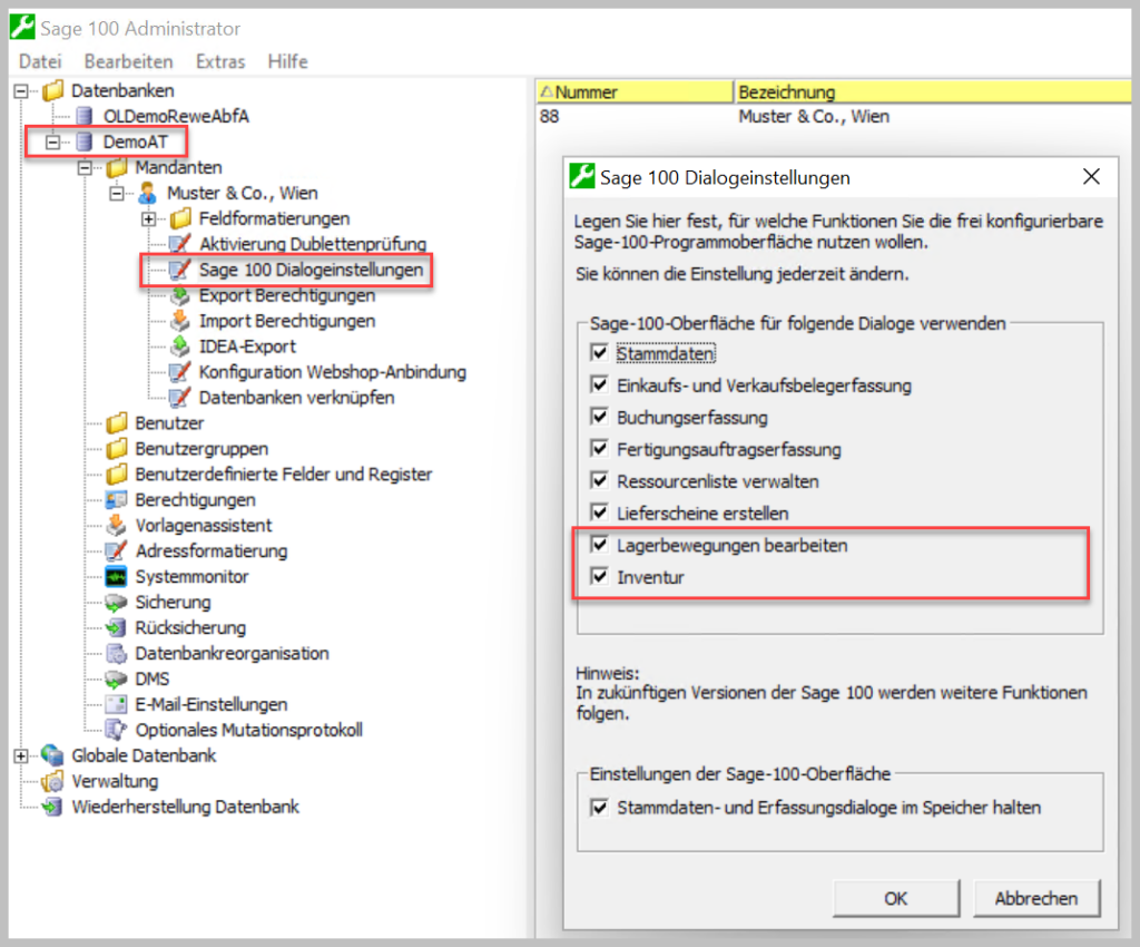 Nach dem Update der Software und der Aktualisierung der Datenbank können Sie optional festlegen, ob die Sage 100 frei konfigurierbaren Masken in den Bereichen der Lagerbewegungen und der Inventur genutzt werden sollen.  Schließen Sie vor der Umstellung die Sage 100 in den Bereichen Warenwirtschaft und Rechnungswesen und wählen Sie im Administrator der Sage 100 die betreffende Datenbank. Die Änderung muss je Mandant erfolgen. Wenn Sie die neuen Masken einsetzen möchten, dann aktivieren Sie im Bereich der Sage 100 Dialogeinstellungen die entsprechenden Auswahlfelder: