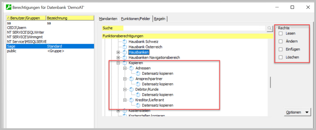 Im Bereich der Berechtigungen können Sie nun für die Stammdaten die Kopierfunktion einschränken. Wählen Sie dazu im Bereich Rewe/Wawi den entsprechenden Bereich und legen die Berechtigung für das Kopieren fest: