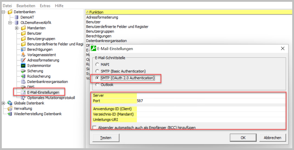 Der SMTP-Mail-Versand über Microsoft Exchange Online wird unterstützt. Neu ist nun, dass die OAuth 2.0 Authentication zur Verfügung steht und eingerichtet werden kann. Diese Einstellungen erfolgen je Datenbank: