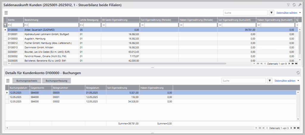 In der Auskunft werden alle Kunden bzw. Lieferanten angezeigt, mit denen es im aktuellen Geschäftsjahr einen Saldenvortrag oder eine Buchung gibt. Im Detailbereich kann man diese Buchungen wählen und den Buchungsnachweis aufrufen oder direkt in die Buchungserfassung wechseln.