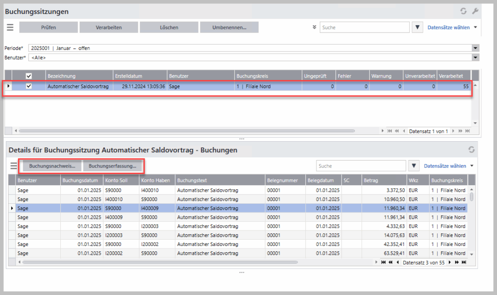 Die bekannten Funktionen Protokollierung, Verarbeiten, Löschen oder Umbenennen von Sitzungen sind weiterhin vorhanden. Der Vorteile dieser neuen Auskunft liegen nicht nur in der vollständigen Buchungsansicht über alle Benutzer, sondern auch in der Anpassbarkeit der Ansicht, um schnell die gewünschten Daten zu erhalten.