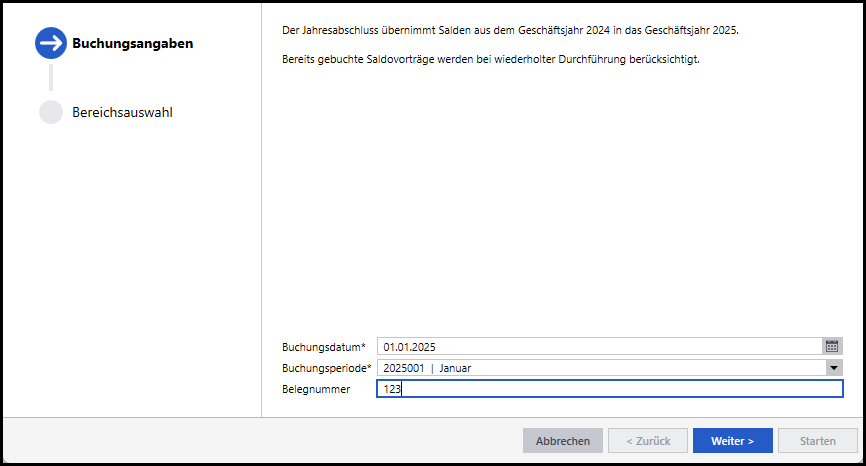 Sie rufen diesen Menüpunkt im alten Geschäftsjahr auf und übergeben die Werte an das neue Geschäftsjahr. Im Auswahldialog stellen Sie die richtigen Werte für die Übergabe ein: