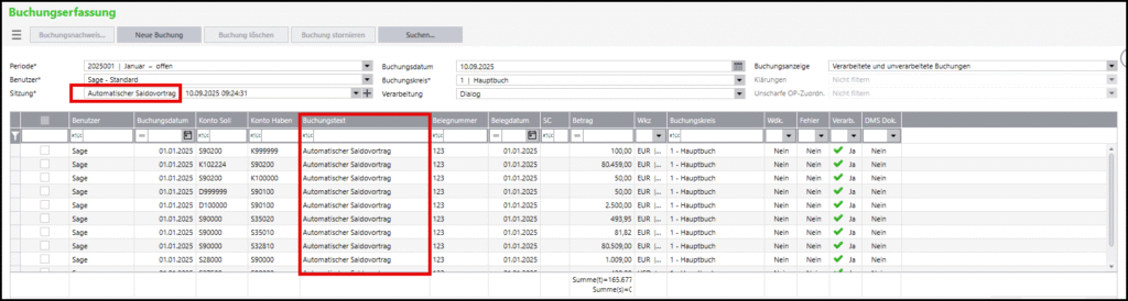 Mit dem Saldenvortrag wird in der Buchungserfassung des neuen Geschäftsjahres eine Sitzung mit der Bezeichnung Automatischer Saldovortrag angelegt.