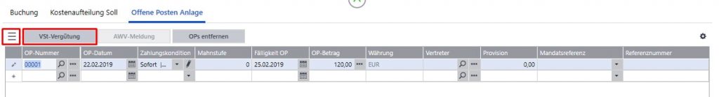 Im Bereich des Offenen Postens geben Sie die relevanten Daten für die Vorsteuervergütung ein. Diese rufen Sie über das Burgermenü oder über den entsprechenden Button auf: