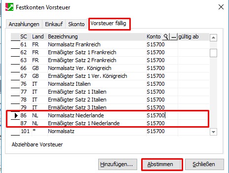 Ordnen Sie dieses Konto in den Festkonten – Vorsteuer im Bereich Vorsteuer fällig dem ausländischen Steuercode zu. Aktivieren Sie den Button Abstimmen, um die neu angelegten Steuercodes in der Aufstellung zu sehen: