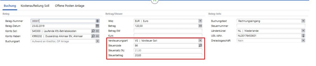Sie buchen in der Buchungserfassung den entsprechenden Aufwand an den Lieferanten und achten dabei auf den korrekten Steuercode für die ausländische Steuer. Der Steuerbetrag wird durch das Programm errechnet:
