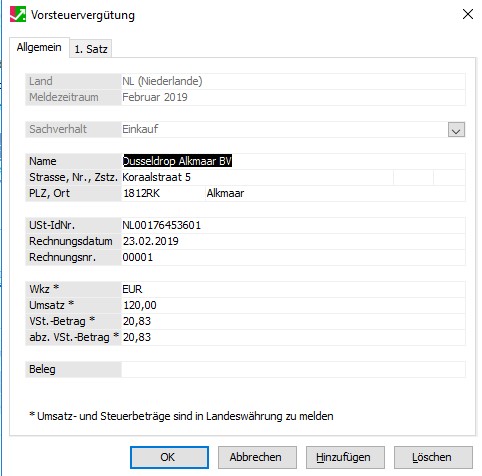 Im Dialog zur Vorsteuervergütung werden die bereits bekannten Daten (Lieferantenadresse, Umsatz und Vorsteuer) aus den Stammdaten bzw. aus der Buchung übernommen. Wenn Sie keinen vollständigen Vorsteuerabzug haben, so können Sie diese Felder manuell überschreiben: