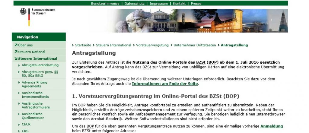 Den Antrag auf Vorsteuervergütung stellen Sie über das Portal des Bundesamtes für Steuern. Der Antrag besteht aus Informationen zum Antragsteller und aus den Anlagen zu den Vorsteuererstattungsbeträgen. Über dieses Portal finden Sie auch eine Anleitung zum Vergütungsantrag USt 1T: