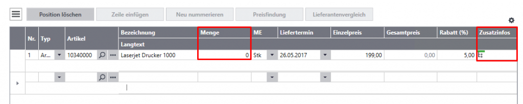 Wird ein Artikel, dem ein Zubehörartikel oder -gruppe zugeordnet wurde, in der Positionserfassung eingefügt, so erkennt man es an der vorgeschlagenen Menge 0 bzw. am Kennzeichen Zusatzinfo: