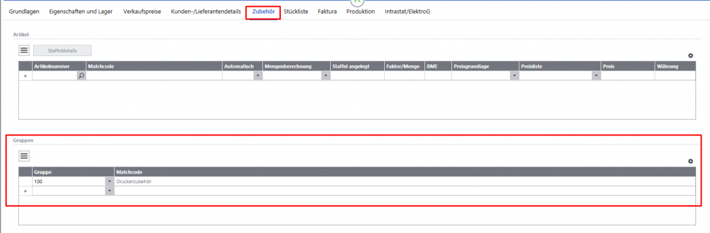 Die Zuordnung der Artikel zur Gruppe erfolgt analog zur Eingabe im Artikelstamm.